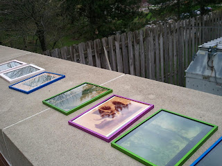 At first the paper will be yellow. A negative is placed over top of the paper and pressed in a printing frame. To make a digital negative, please see blog entry Making a Digital Negative. Exposure time will vary